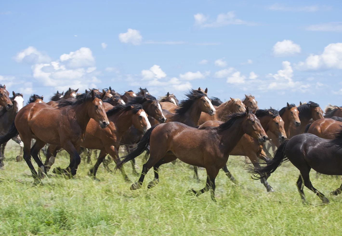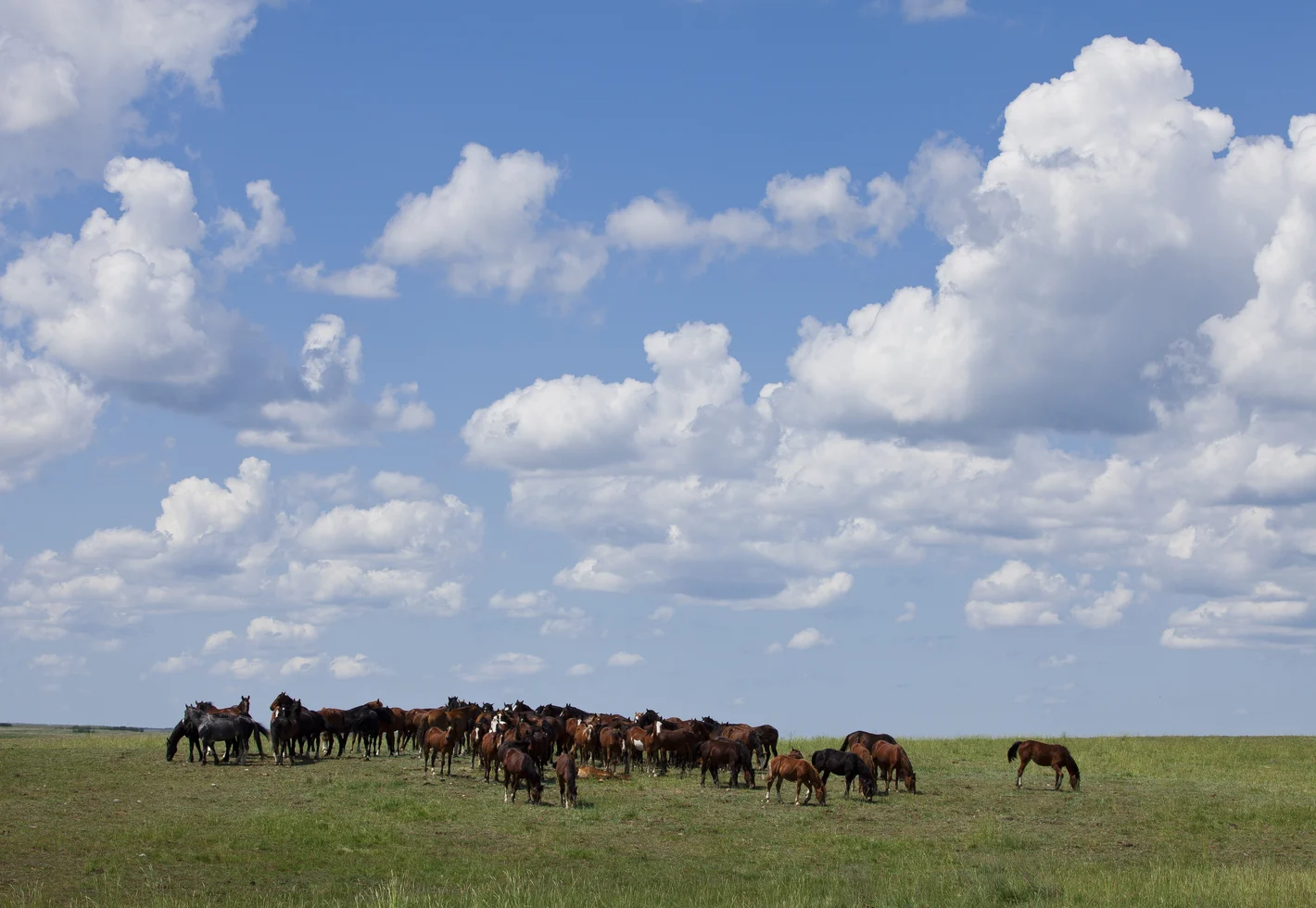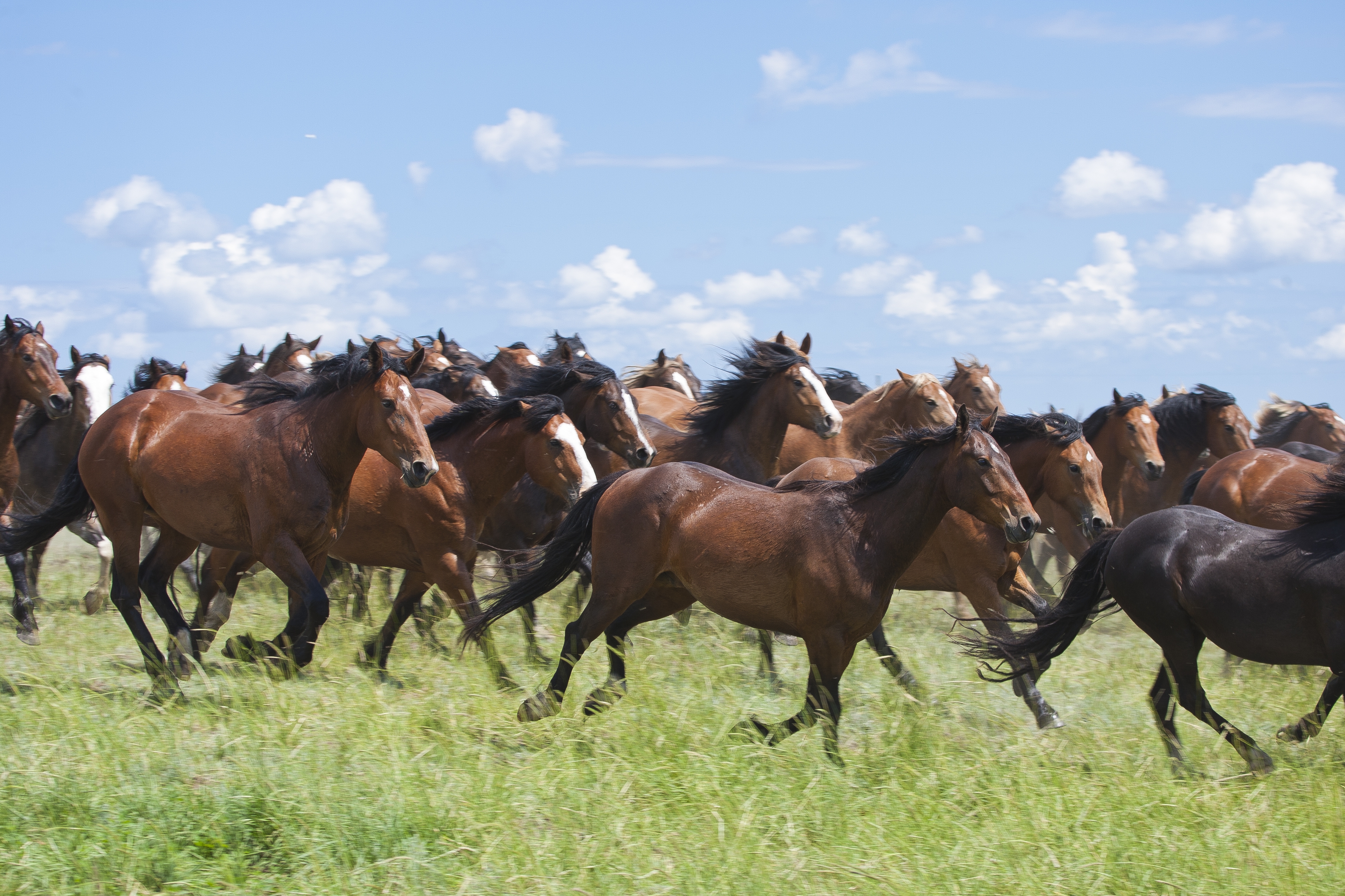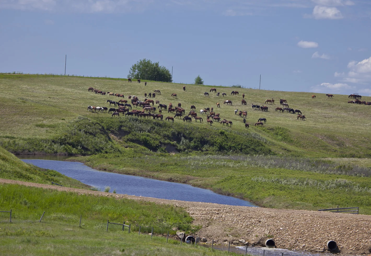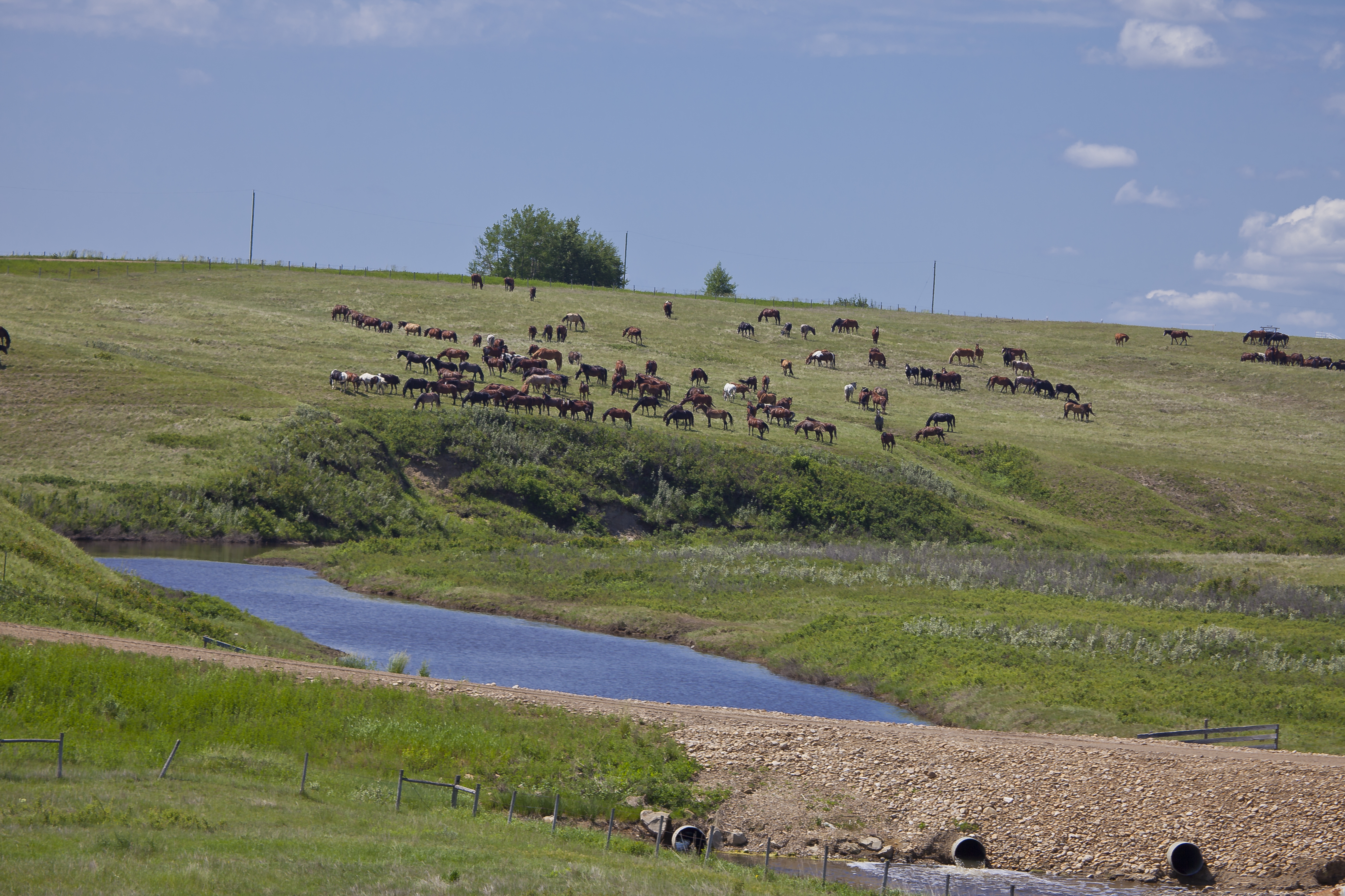 Calgary Stampede bucking horses enjoy a natural herd environment, grazing the 23,000 acres of grassland at the Stampede Ranch. In addition to free-range grass, they are fed a supplementary diet of oats and hay. As part of their natural herd social dynamics, they share their pastureland and the creek that runs through it with species indigenous to the area, such as white tail and mule deer, pronghorn antelope, and many species of birds and small mammals.
