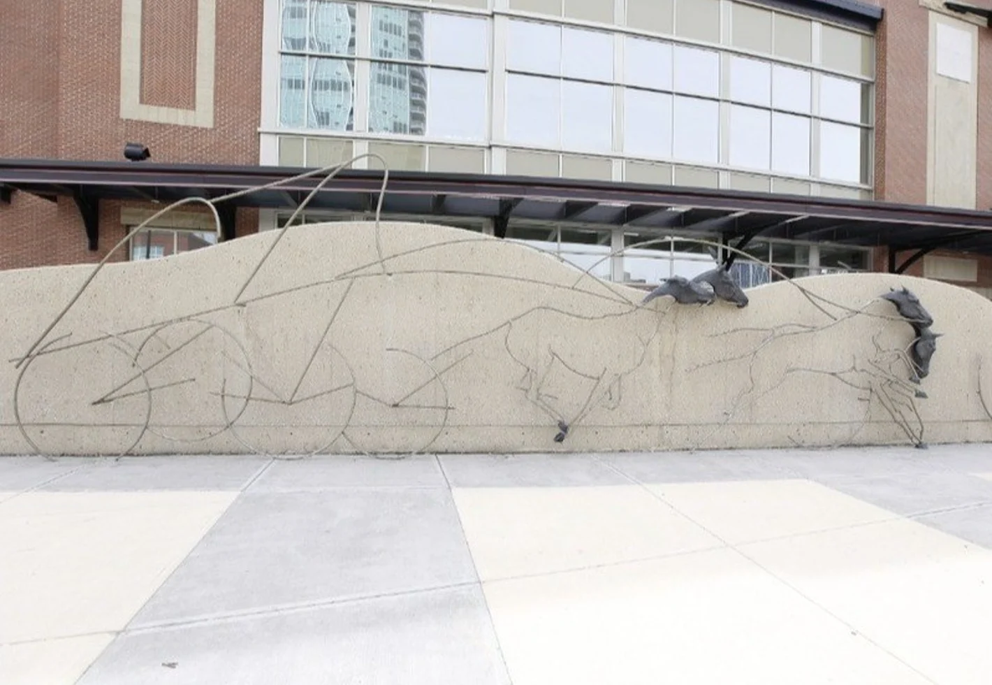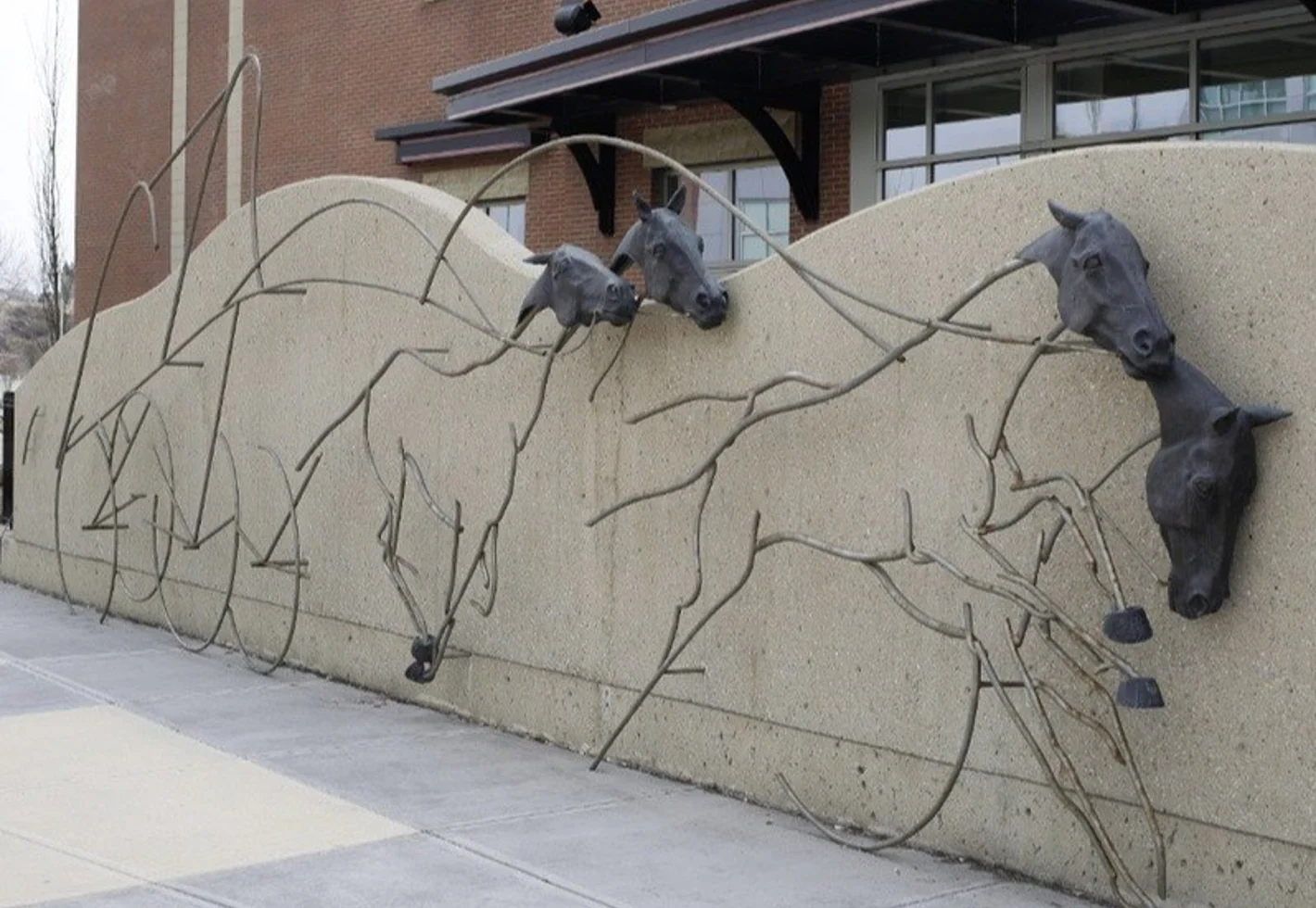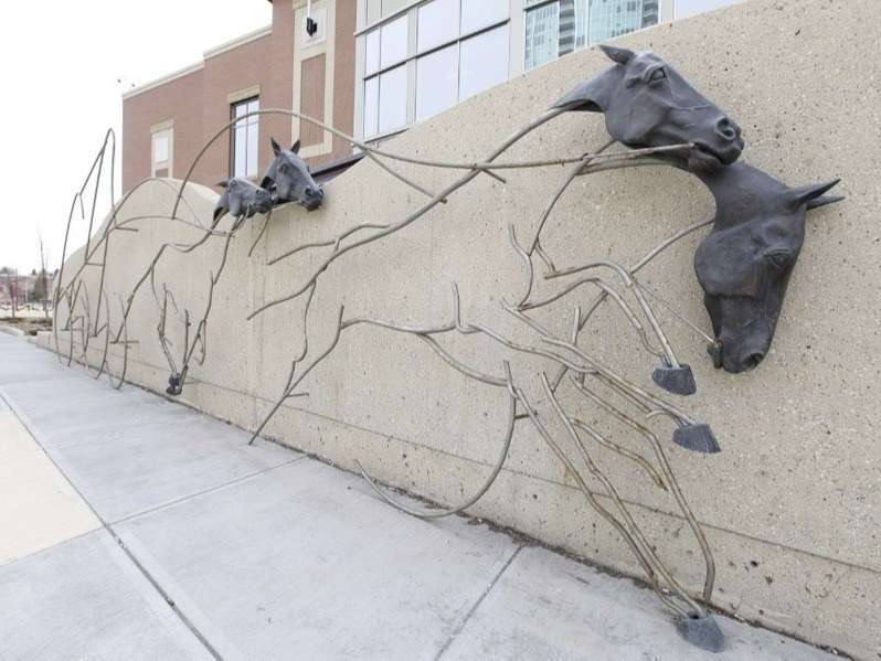 This sculpture’s low and high relief work captures the essence of the chuckwagon teams stampeding and pounding together in close competition.